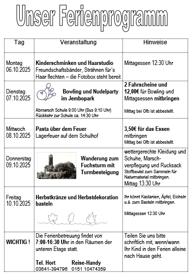 Zu folgenden Zeiten ist der Hort im Schuljahr 2025/2026 geschlossen: